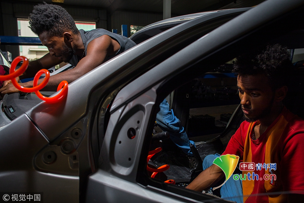 东方工业园内一家汽车组装厂,18岁的贝亚姆(右)在生产线上工作。