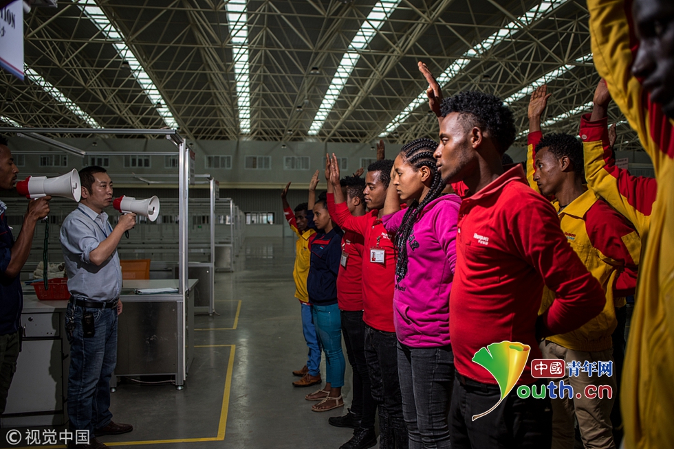 7月31日,埃塞俄比亚首都亚的斯亚贝巴的一家中国民营制鞋工厂——华坚鞋厂,下午的工作开始前,当地雇员用中文喊着“一二三四”列队集合,合唱厂歌。