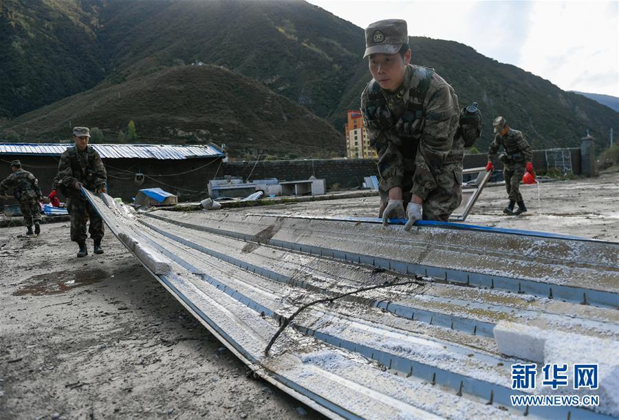 10月13日,西藏昌都军分区前方救灾官兵在波罗乡一工地用房处忙碌。 11日晨,金沙江流经的川藏交界江达县波罗乡波公村发生山体滑坡,形成堰塞湖。 江达县波罗乡地处藏曲河与金沙江交汇处的岸边,受这次山体滑坡影响较大,一度被淹。记者在藏曲河畔看到,公安、消防、国电、测绘、气象、武警、解放军等抢险救灾人员正在紧张工作。 据现场人员介绍,今天波罗乡所在地水位下降迅猛。记者目睹河岸两侧之前被淹过的痕迹清晰可见,通往波罗乡被淹没的桥梁此时部分已经露出水面。 新华社记者 刘东君 摄