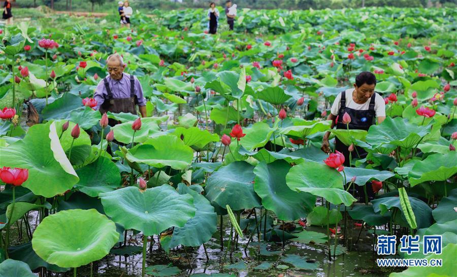 6月3日,荷农们在荷花基地里挑选准备出售的观赏性荷花。新华社记者 徐昱 摄