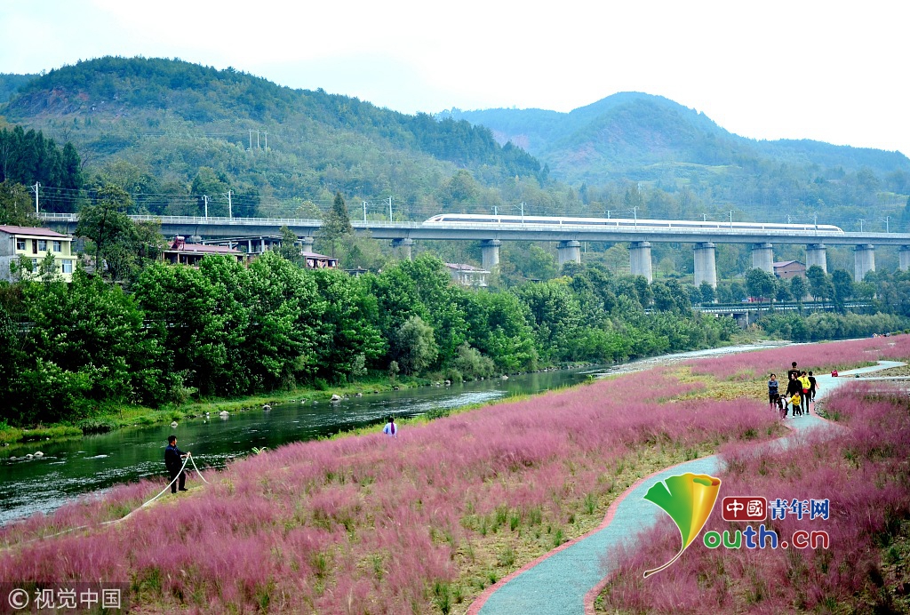 2018年10月14日,陕西汉中,西成高铁汉中市宁强县高寨子路段上的一列动车正从红艳艳的芦苇花海附近驶过。