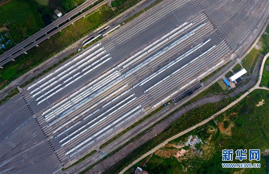 这是广西南宁动车所内准备发往各地的动车组列车(7月1日无人机拍摄)。 广西壮族自治区成立60年来,铁路建设发生翻天覆地的变化。来自中国铁路南宁局集团有限公司的数据显示,1958年广西铁路总里程为1346.3公里,如今广西铁路总里程达5191公里。广西与周边相邻省份间实现动车“公交化”开行。此外,北部湾港—重庆班列、东盟海产品冷链班列、“百色一号”果蔬专列等的开通和运营,强化了铁路供给的针对性和有效性。铁路成为助推广西经济社会快速发展的“大动脉”。 新华社记者黄孝邦摄