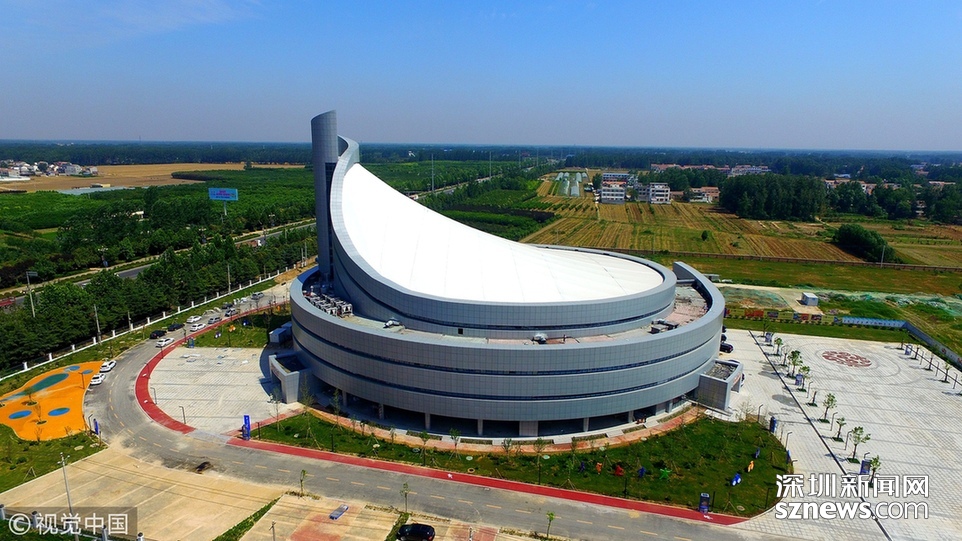 2018年6月13日,航拍河南淮阳一座即将竣工落成的体育场馆建筑,市民称酷似一个石磨盘。