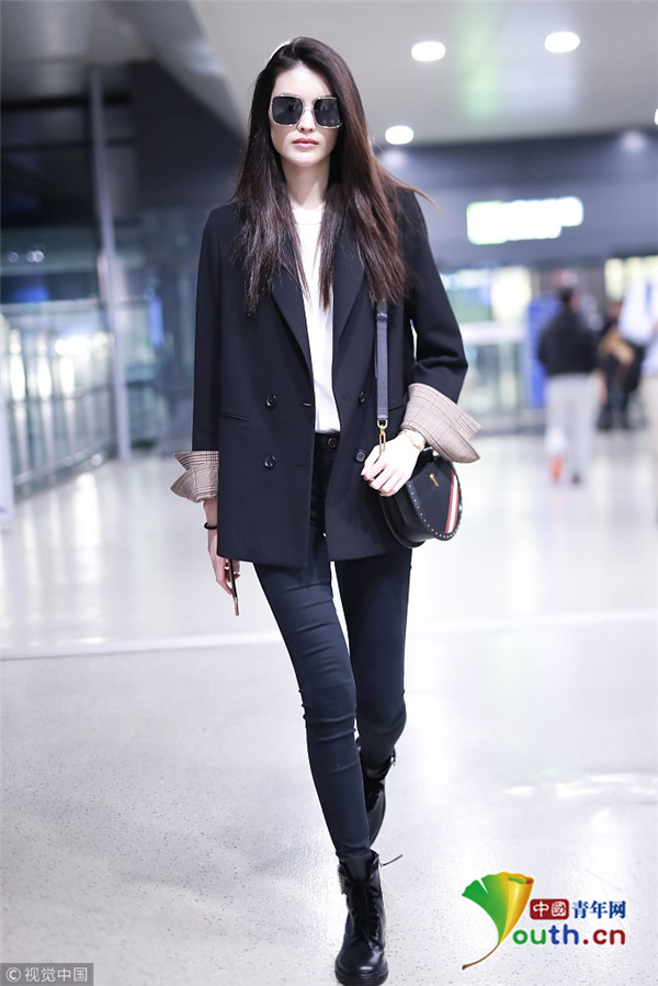 2018年10月15日,上海,何穗亮相机场。她身穿深色西装搭配黑色紧身裤大秀超模身材,简约造型依旧高级感十足,轻撩秀发散发女人味。