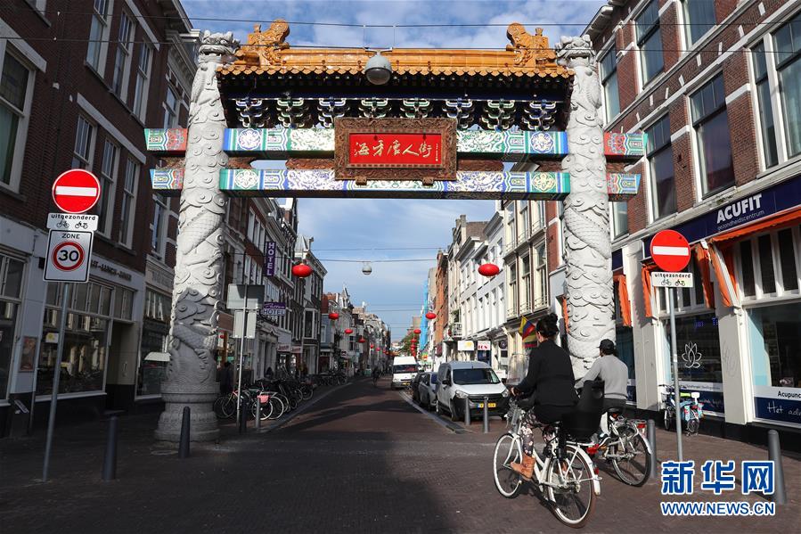 10月15日,在荷兰海牙,人们骑车经过唐人街的牌坊。 新华社记者郑焕松 摄