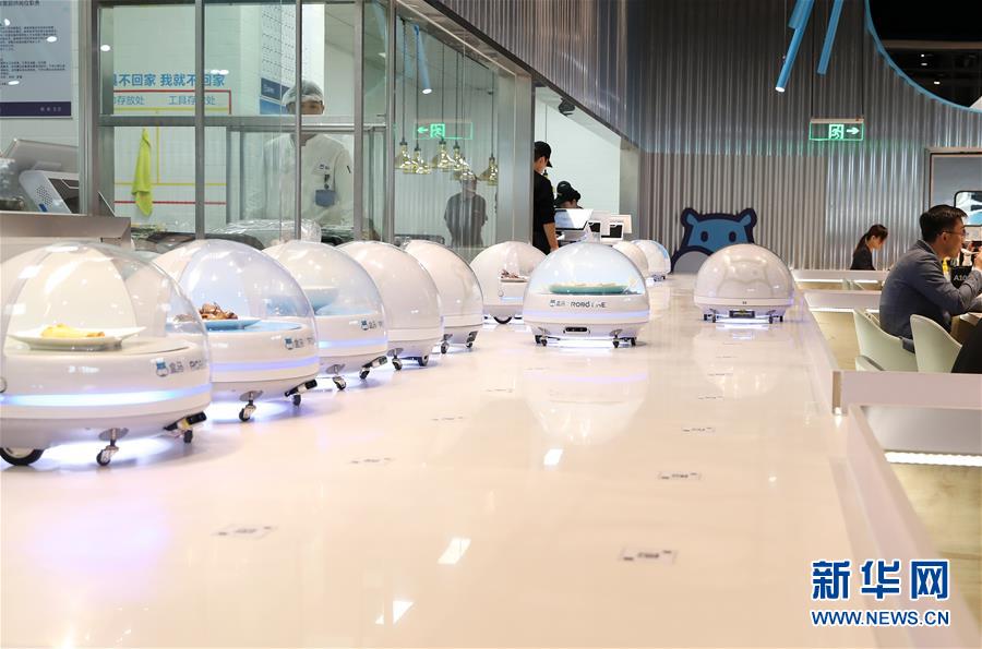 近日,一家由机器人充当送餐服务员的盒马机器人餐厅现身上海国家会展中心,为顾客带来一种用餐新选择。