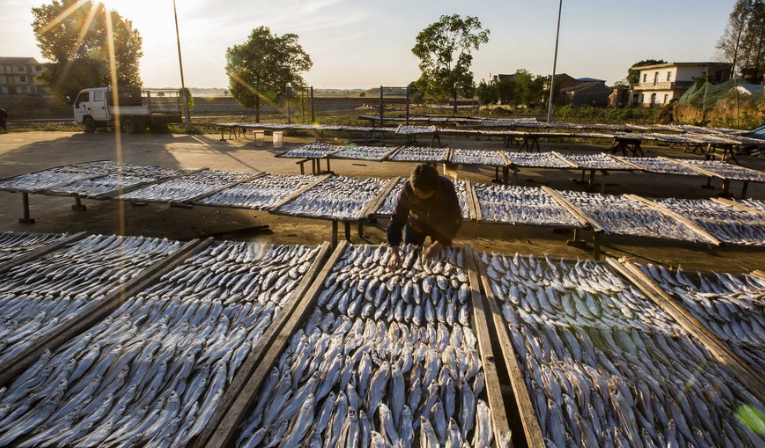 鄱阳湖畔渔民趁秋光晾鱼虾