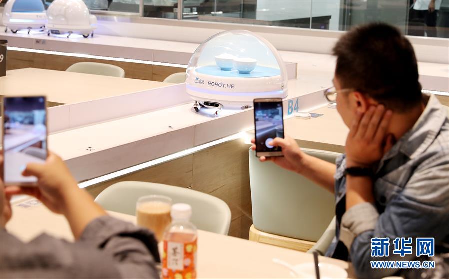10月15日,在机器人餐厅用餐的顾客拍摄送餐机器人。 新华社记者 方喆 摄