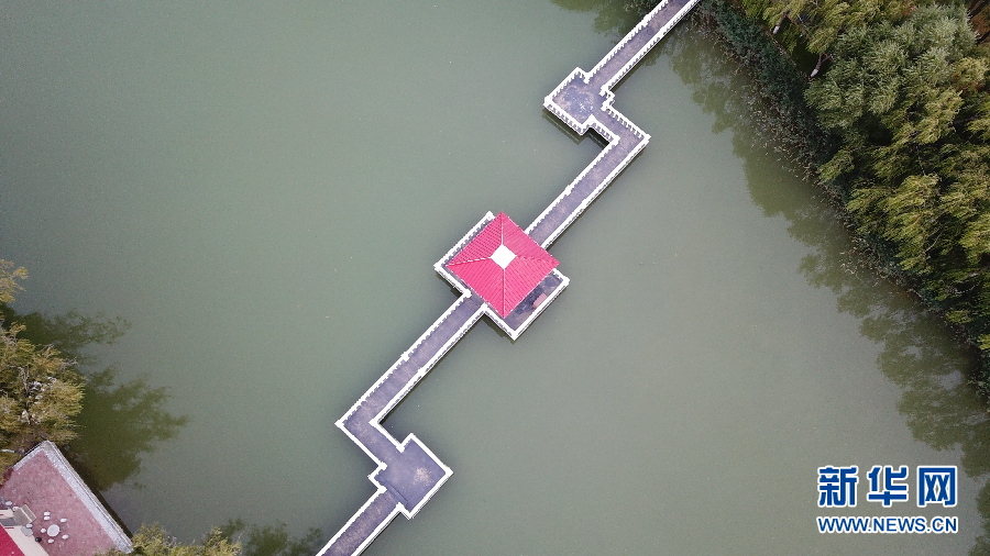 恩格贝生态示范区位于库布齐沙漠中段,总面积200平方公里。这里曾经风沙肆虐,恩格贝生态示范区建设者经过长期艰苦奋斗,用双手和铁锹“种”出一片人造沙漠绿洲,在沙漠里打造了一颗璀璨的生态明珠,如今这里是国家生态旅游示范区和国家4A级景区。月亮湖位于恩格贝生态示范区核心区域,周围被绿色植被环绕,在无人机航拍视角下,犹如镶嵌在沙漠绿洲里的一块碧玉,呈现出大自然的和谐之美。(新华网 王宇 摄)