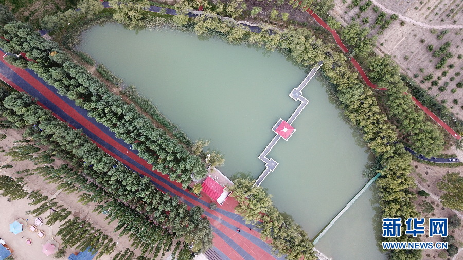 恩格贝月亮湖犹如镶嵌在沙漠绿洲里的一块碧玉。(新华网 王宇 摄)