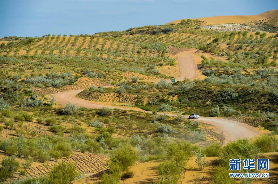 车辆在银肯塔拉沙漠绿洲自然生态旅游区中穿行(6月7日摄)。