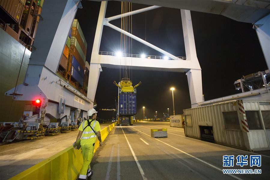 10月15日晚,一名工人在比利时泽布吕赫港集装箱码头工作。 新华社记者 叶平凡 摄