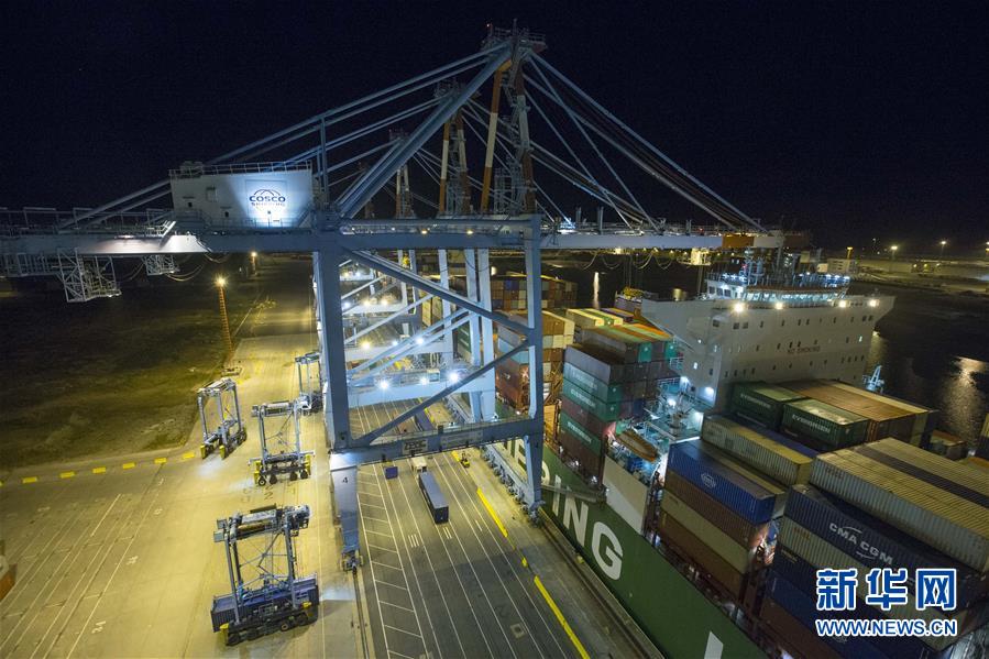 这是10月15日晚在比利时泽布吕赫港拍摄的正在进行装卸作业的集装箱码头。新华社记者 叶平凡 摄