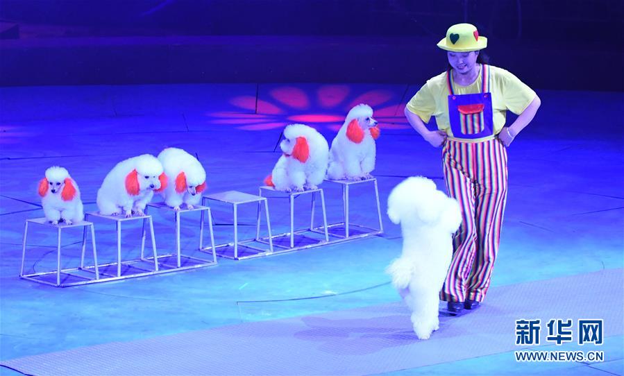10月16日,马戏团演员在濮阳国际杂技艺术节上表演马戏《小狗当家》。