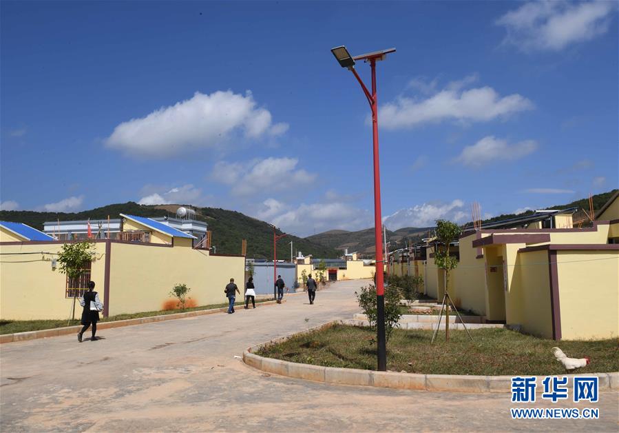 10月16日,人们行走在砚山县小补佐村的道路上。 云南省文山壮族苗族自治州砚山县稼依镇小补佐村有55户200多名壮族群众曾经居住在大山深处。2017年10月,在政府的帮扶下,小补佐村易地扶贫建设新村,村民全部搬迁入住新居。 新华社记者 杨宗友 摄