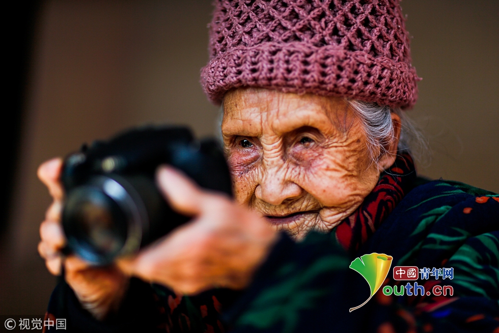 2017年03月02日,广西壮族自治区桂林市恭城瑶族自治县莲花镇莲花街上,有一个慈眉善目的老人李玉珍,大家都亲切地叫她“容伯娘”。她不仅是镇上硕果仅存的两位百岁老人之一,还是镇上那个最老照相馆的摄影师。老人拿起数码相机拍摄照片的眼神依旧犀利。图片作者:游拥军/视觉中国