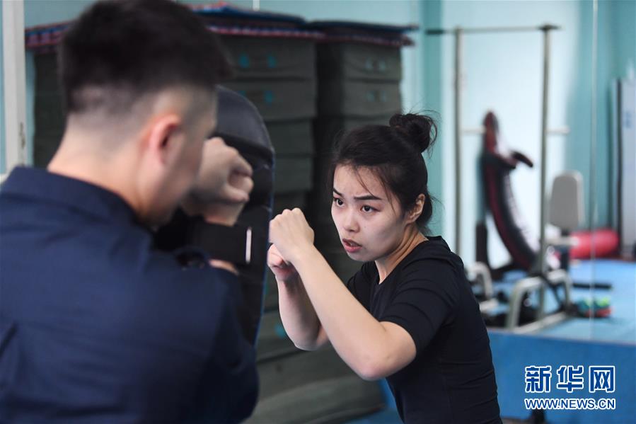 10月16日,汤春燕在健身房内进行擒敌训练。