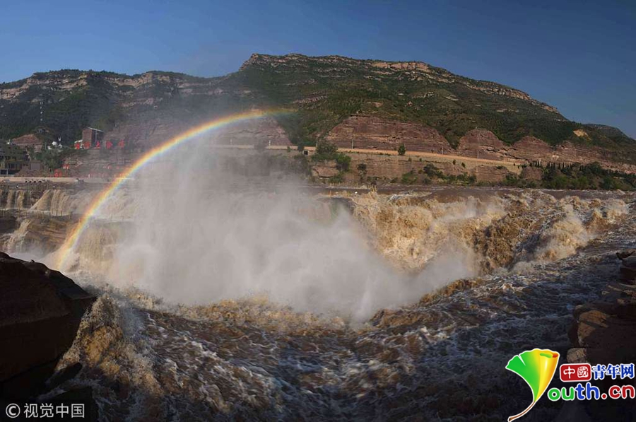 5月31日,山西临汾奔腾咆哮的黄河壶口瀑布吸引游客。近日,受上游地区降雨量增多影响,黄河干流晋陕峡谷水量大增,每秒流量达到1100立方,是常年同期的三倍,壶口瀑布出现五月份罕见的瀑布群景观,吸引了众多游客。