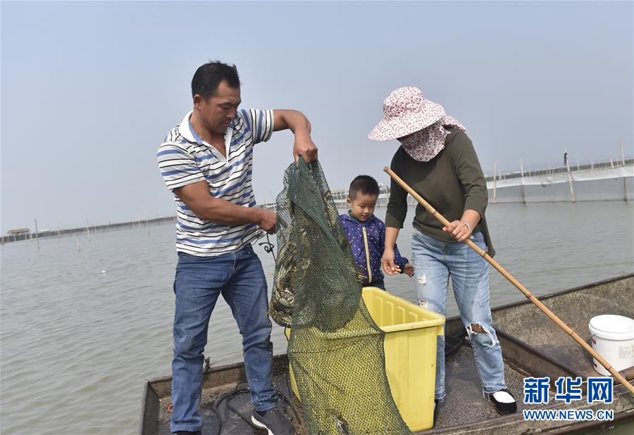 10月17日,湖州庙港人水产有限公司蟹农在太湖养殖基地捕捞大闸蟹。 时值重阳,太湖南岸的大闸蟹开始大批量上市,迎来丰收季。浙江省湖州市近年来结合太湖水治理,提升太湖渔业资源质量。目前,湖州太湖蟹养殖面积3.6万亩左右,年产3000多吨。 新华社记者钱一摄