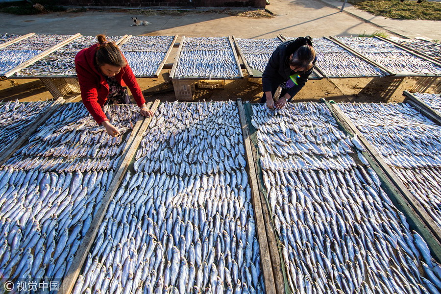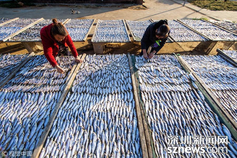 鄱阳湖畔渔民趁秋光晾鱼虾庆丰收