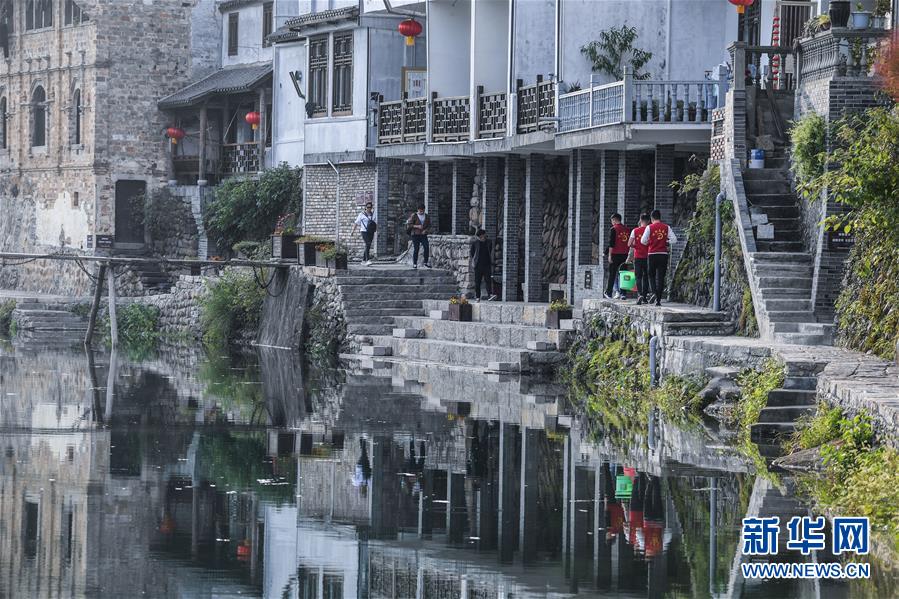 10月17日,河桥镇的青年党员们在镇边的昌南溪边巡查,并清理两岸的废弃物。新华社记者 徐昱 摄