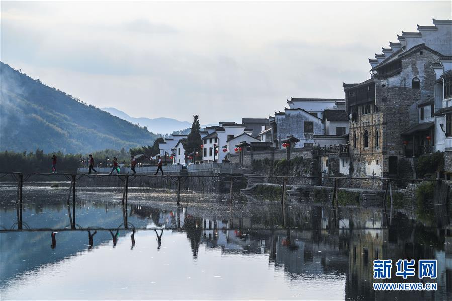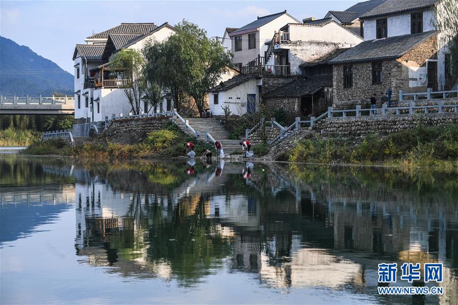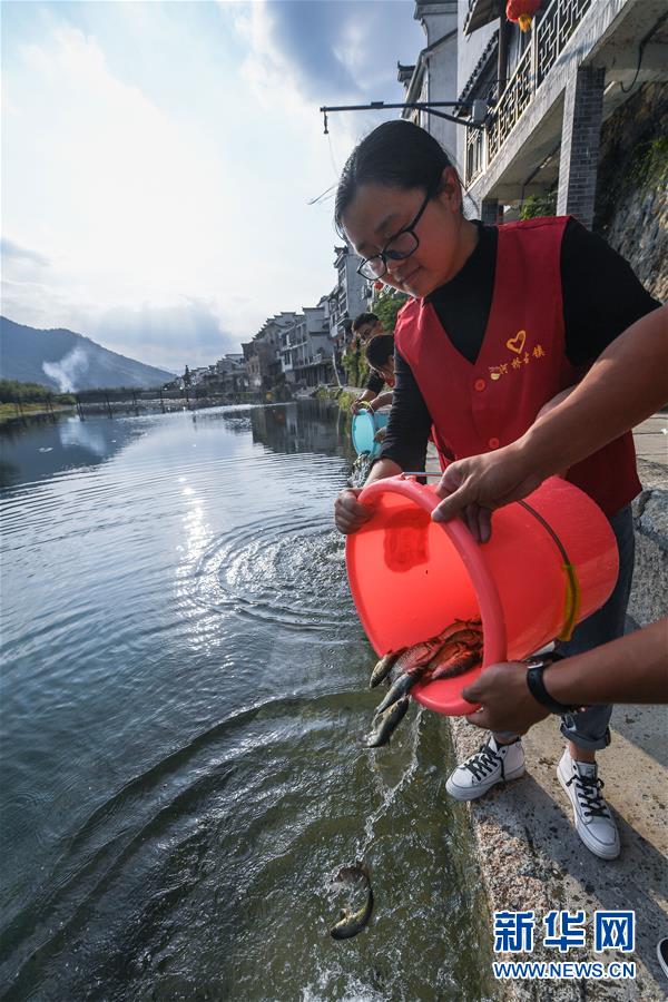 10月17日,河桥镇的青年党员们在镇边的昌南溪投放鱼苗。新华社记者 徐昱 摄
