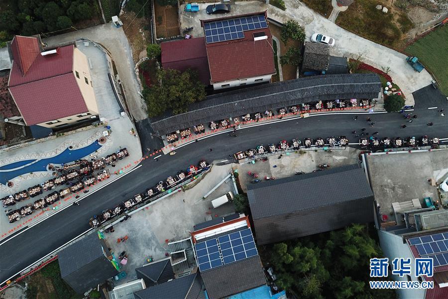 10月17日,村民与宾客在龙峰民族村参加“长桌宴”(无人机拍摄)。 当日,在浙江省桐庐县莪山畲族乡龙峰民族村,一百桌宴席沿道路摆成一字长蛇阵,四方宾客和当地村民一起品尝着具有畲族特色的菜肴,场面颇为壮观。 新华社记者 黄宗治 摄