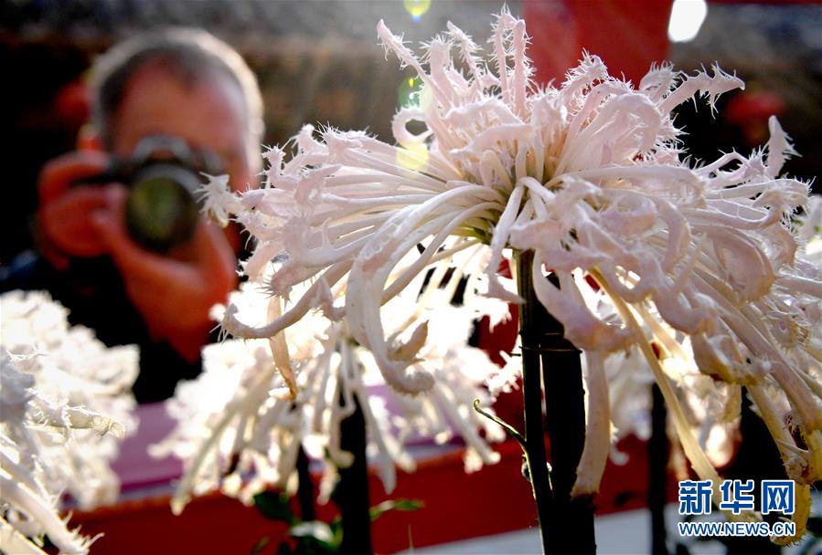 10月17日,游客在开封清明上河园内拍摄展出的菊花。重阳时节,各色菊花竞相绽放,把古都开封装点得分外秀美,吸引众多游客前来观赏游玩。 新华社记者 李安 摄