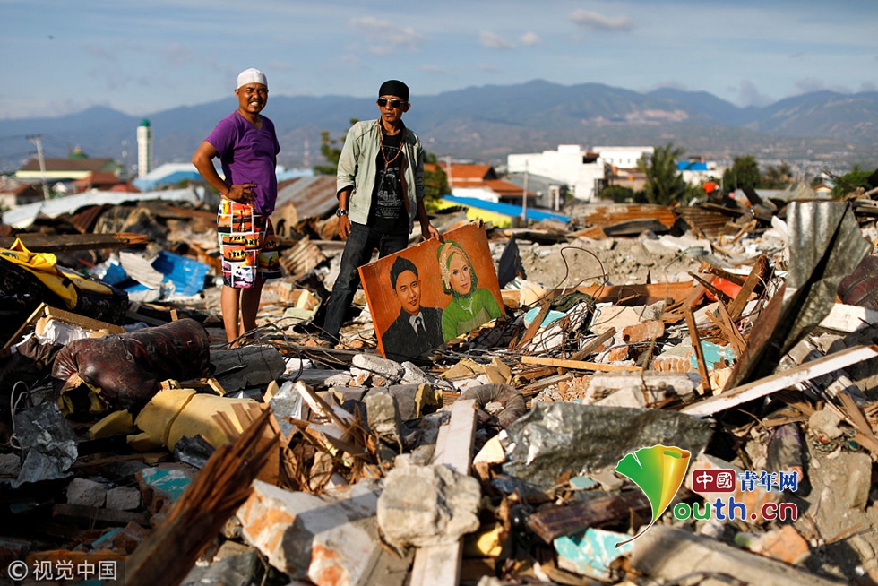 当地时间2018年10月7日,印尼帕卢,两名男子从地震废墟中找回他们去世父母的画像。图片作者:JORGE SILVA/视觉中国
