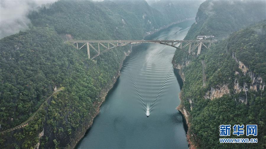 10月18日无人机航拍的江界河大桥。 当日,位于贵州瓮安县的江界河大桥云雾环绕,景美如画。 新华社记者欧东衢摄