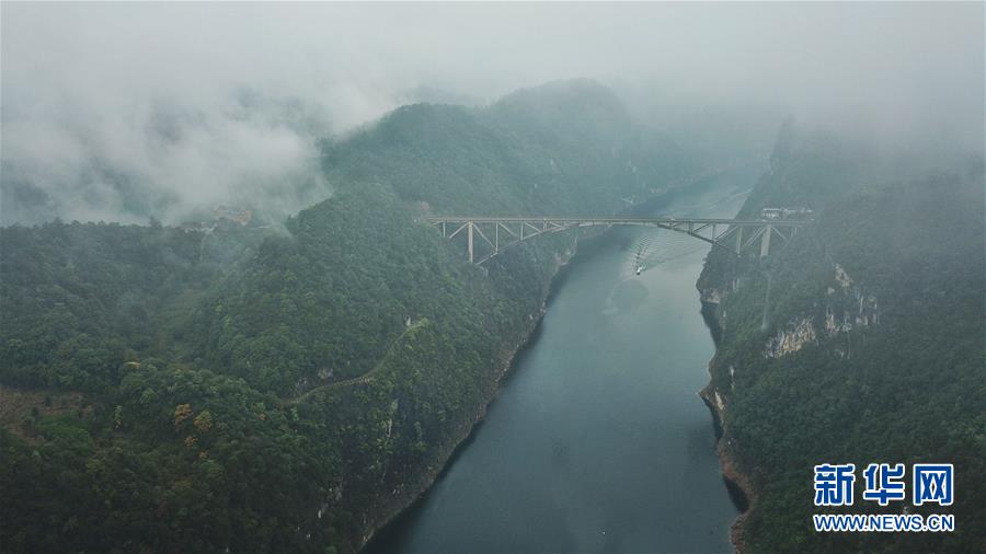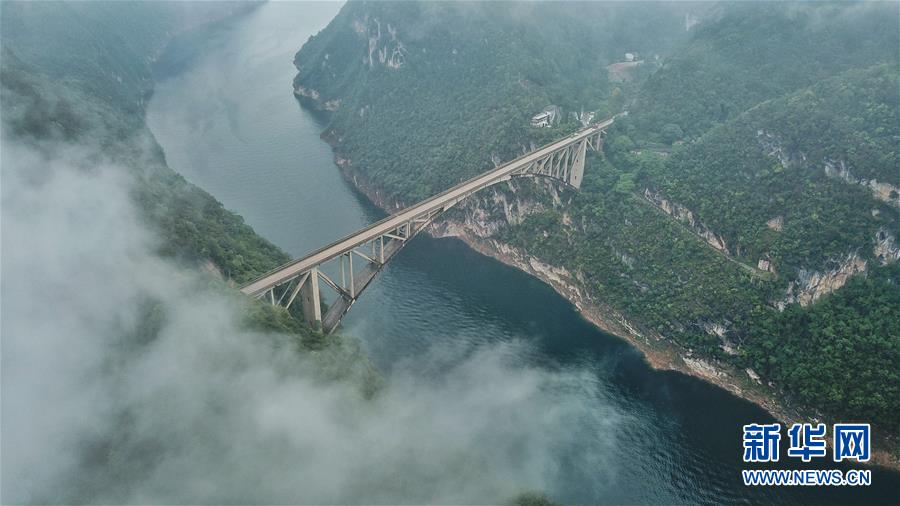10月18日无人机航拍的江界河大桥。 当日,位于贵州瓮安县的江界河大桥云雾环绕,景美如画。 新华社记者欧东衢摄