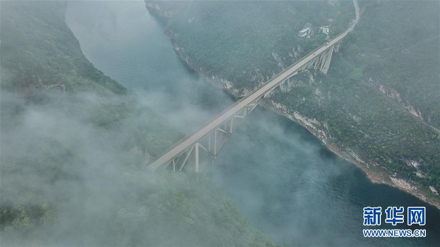 8月27日,位于贵州省瓮安县的清水河大桥云雾缭绕,景色如画。