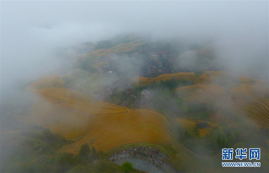 10月16日,游客在秋雨中欣赏龙脊梯田秋色(无人机拍摄)。金秋时节,广西龙胜各族自治县龙脊梯田美如画卷。 新华社记者 黄孝邦 摄