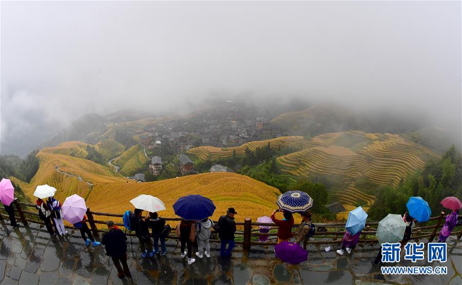 10月16日,游客在秋雨中欣赏龙脊梯田秋色。金秋时节,广西龙胜各族自治县龙脊梯田美如画卷。 新华社记者 黄孝邦 摄