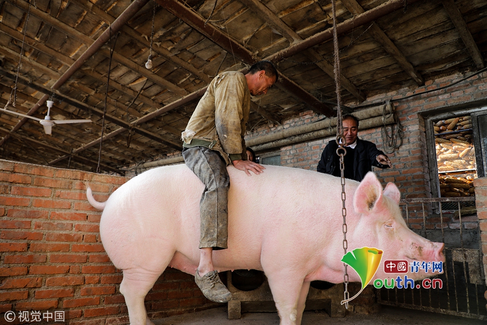 2018年10月16日,辽宁丹东,当着来围观的乡亲的面,养猪人张先生小心翼翼地骑上了猪背,希望用这样的造型求关注。图片作者:棋簿紫/视觉中国