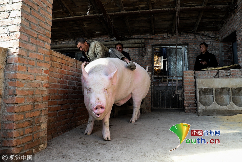 村里一位83岁的老人在围观时说,活了一辈子第一次见到这么大的猪,猪是好猪,但是卖不出去愁人啊。900斤大猪是个什么概念?体长2米25、腰围1米75,站立高度1米10。此时此刻,900斤大猪完全不知主人的苦,也完全不知道外面的世界发生了什么。图为养猪户张先生险些从900斤大猪背上摔下来。图片作者:棋簿紫/视觉中国