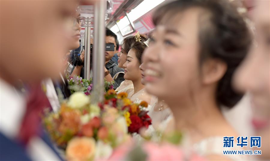10月18日,在合肥市地铁一号线车厢内,新人们互相许诺,期许爱情。 当日,中铁四局集团城市轨道交通工程分公司的18对新人在安徽合肥地铁一号线的车厢里举行了一场集体婚礼仪式。 新华社记者 郭晨 摄
