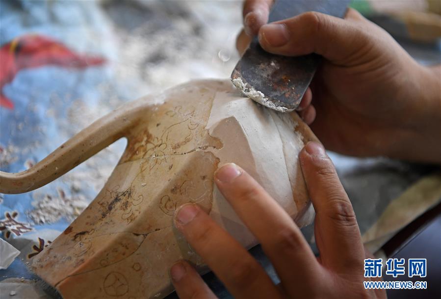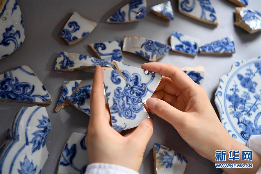 10月18日,在江西景德镇,工作人员修复明代古瓷片。 新华社记者 万象 摄