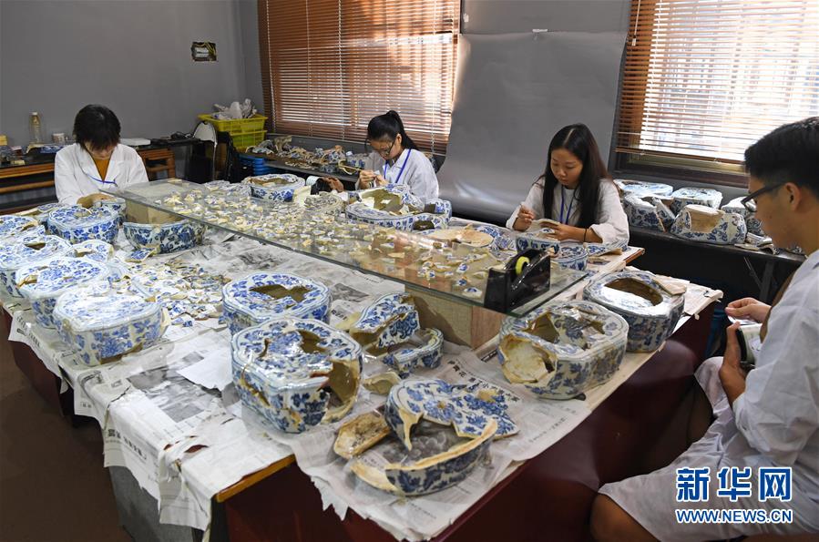 在江西景德镇,工作人员修复明代瓷枕(9月20日摄)。 新华社记者 万象 摄
