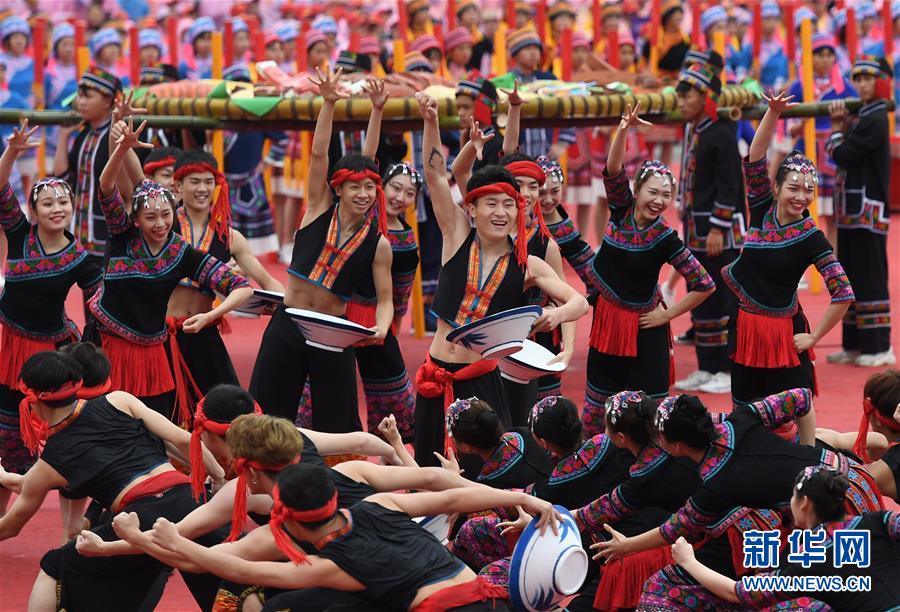 10月20日,各族同胞在广西大化瑶族自治县江滨文化广场表演节目,庆祝县庆。 新华社记者陆波岸摄