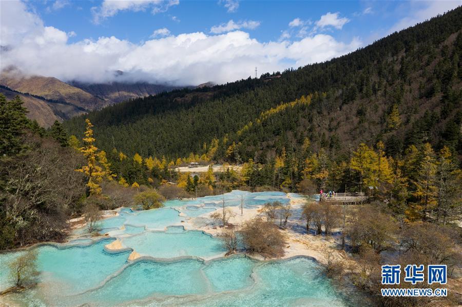 蓝天白云与彩林、彩池构成一幅美丽画卷(10月19日无人机拍摄)。深秋时节,在雪山、蓝天、白云和彩林映衬下,黄龙沟中的彩池色彩更加斑斓,目前黄龙景区进入观赏最佳时节。黄龙风景名胜区位于四川省松潘县境内,以彩池、滩流、雪山、峡谷、森林等闻名,享有“人间瑶池”“圣地仙境”之美誉。新华社记者 江宏景摄