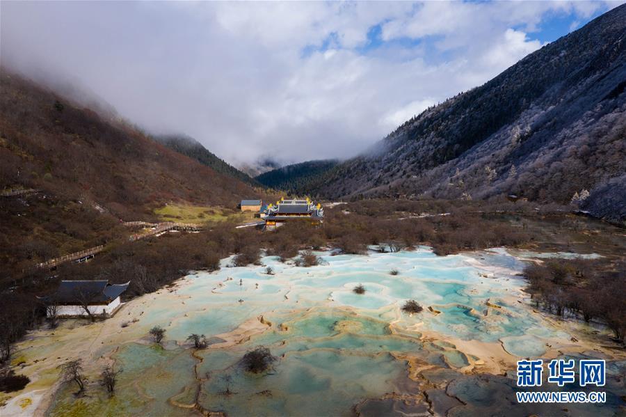 俯瞰黄龙沟五彩池和黄龙寺(10月19日无人机拍摄)。深秋时节,在雪山、蓝天、白云和彩林映衬下,黄龙沟中的彩池色彩更加斑斓,目前黄龙景区进入观赏最佳时节。黄龙风景名胜区位于四川省松潘县境内,以彩池、滩流、雪山、峡谷、森林等闻名,享有“人间瑶池”“圣地仙境”之美誉。新华社记者 江宏景摄