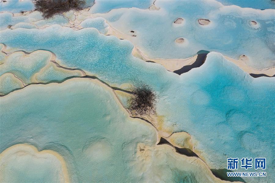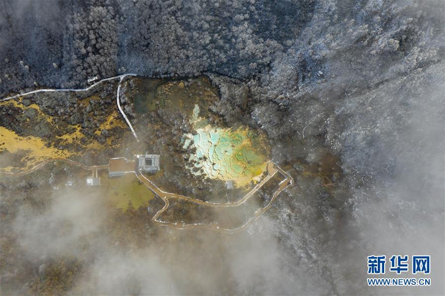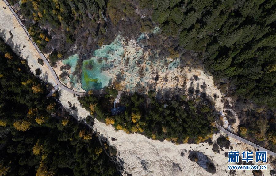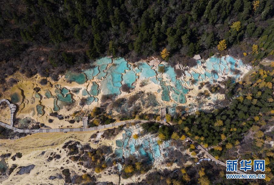 俯瞰黄龙沟争艳池一角(10月19日无人拍机摄)。深秋时节,在雪山、蓝天、白云和彩林映衬下,黄龙沟中的彩池色彩更加斑斓,目前黄龙景区进入观赏最佳时节。黄龙风景名胜区位于四川省松潘县境内,以彩池、滩流、雪山、峡谷、森林等闻名,享有“人间瑶池”“圣地仙境”之美誉。新华社记者 江宏景摄