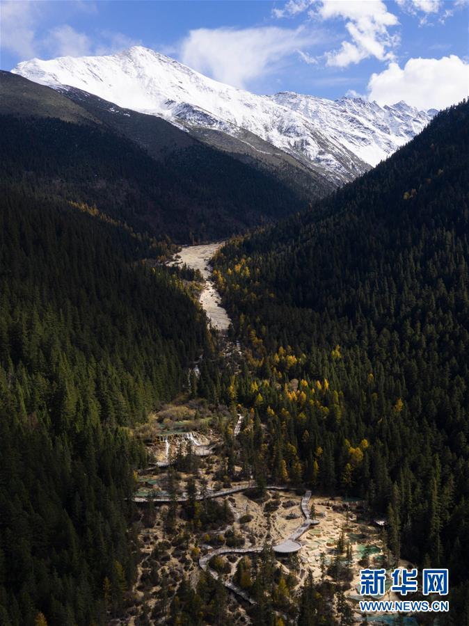 黄龙沟在蓝天白云、雪山和彩林的映衬下风景如画(10月19日无人机摄)。深秋时节,在雪山、蓝天、白云和彩林映衬下,黄龙沟中的彩池色彩更加斑斓,目前黄龙景区进入观赏最佳时节。黄龙风景名胜区位于四川省松潘县境内,以彩池、滩流、雪山、峡谷、森林等闻名,享有“人间瑶池”“圣地仙境”之美誉。新华社记者 江宏景摄
