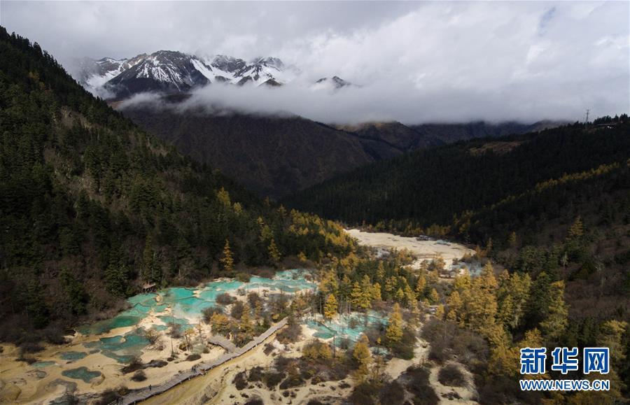 雪山、彩林、彩池构成一幅色彩斑斓的画卷(10月19日无人机拍摄)。深秋时节,在雪山、蓝天、白云和彩林映衬下,黄龙沟中的彩池色彩更加斑斓,目前黄龙景区进入观赏最佳时节。黄龙风景名胜区位于四川省松潘县境内,以彩池、滩流、雪山、峡谷、森林等闻名,享有“人间瑶池”“圣地仙境”之美誉。新华社记者 江宏景摄