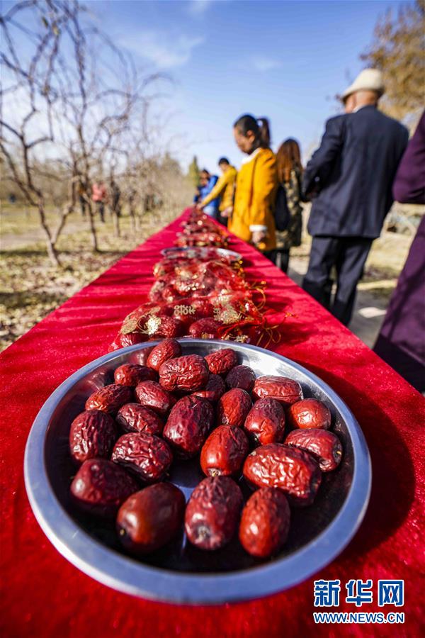 10月20日,在且末县阿热勒镇有机红枣园里,红枣经销商在品尝红枣。 新华社记者 赵戈 摄