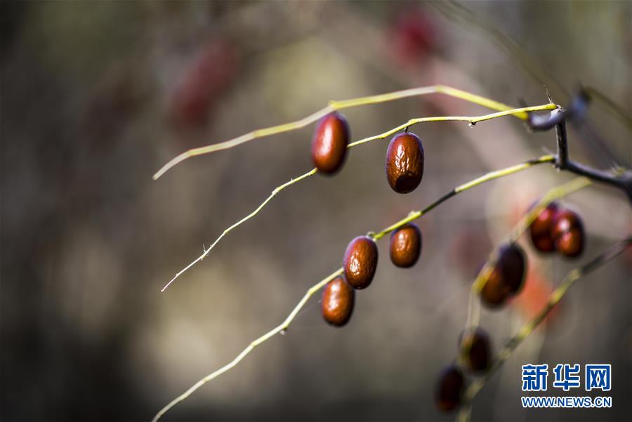 10月20日,在且末县阿热勒镇有机红枣园里,成熟的红枣挂在枝头。 新华社记者 赵戈 摄