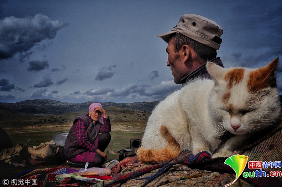 哈萨克族牧民整理行裹准备迁徙。