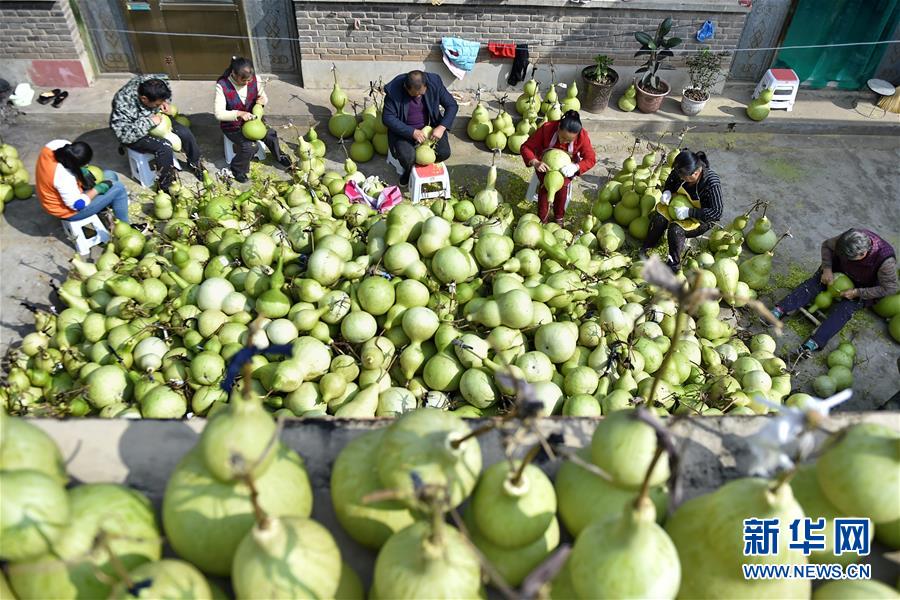 9月27日,山西省安泽县和川镇孔旺村的村民在摘葫芦。近日,山西省安泽县和川镇孔旺村种植的葫芦喜获丰收,村民们忙着将摘下的葫芦去皮晾干。孔旺村于2016年成立葫芦种植合作社,种植、采摘、加工等环节全部由贫困户负责,为贫困户拓宽增收渠道。新华社记者 曹阳 摄
