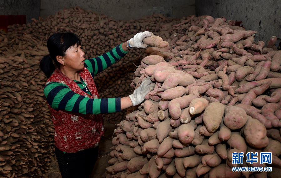 10月17日,陕西延安甘谷驿镇史家沟村村民在整理刚收获的红薯。 金秋时节,农民们忙着收获成熟的农作物,喜迎丰收。 新华社记者 刘潇 摄